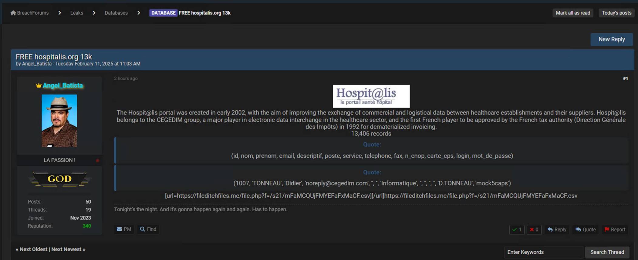 TR: [Club RSSI] - Re: Un attaquant a partagé une base de données liées au domaine hospitalis.org sur BreachForums | Criticité : Élevée