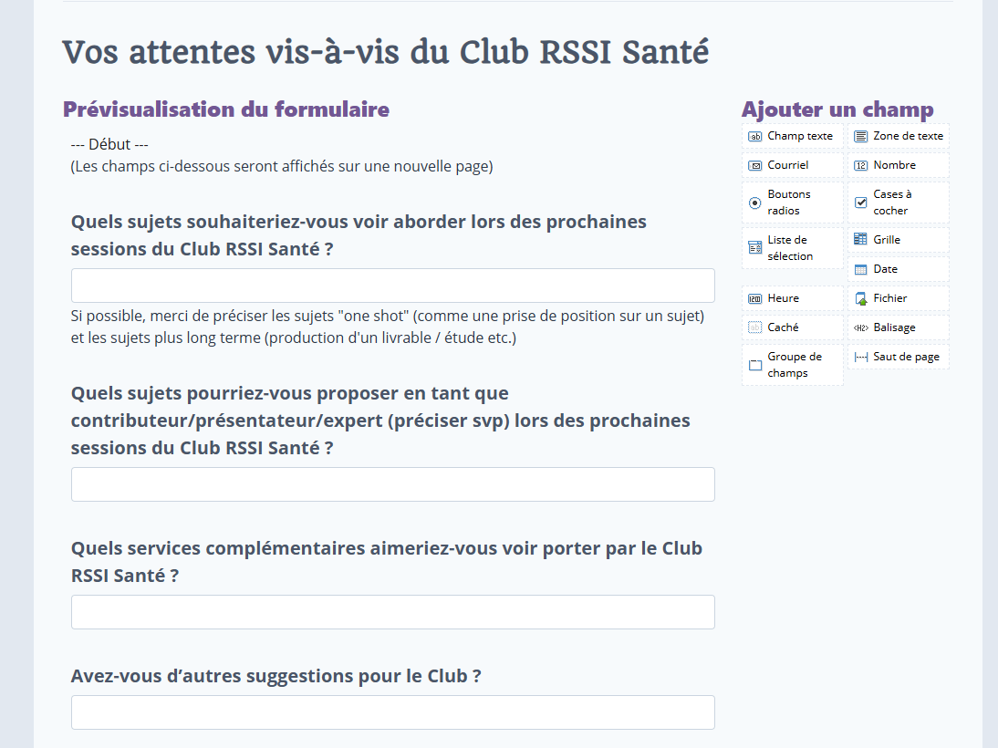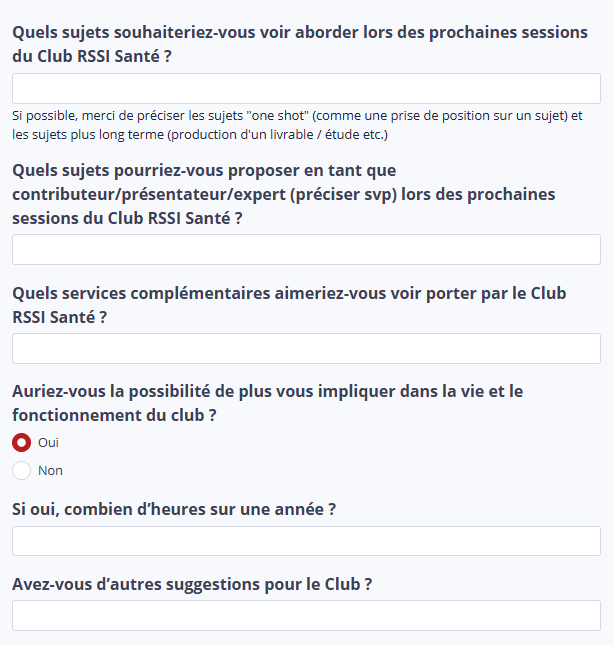 Bonjour à tous, Comme évoqué lors du CA, je vous propose de lancer un sondage de « prise de température » auprès de nos membres, qui devraient permettre de construire les prochaines sessions du Club ; Ma proposition de questions – je suis pas très inventif : 1/ Quels sujets souhaiteriez-vous voir aborder lors des prochaines sessions du Club RSSI Santé ? 2/ Quels sujets pourriez-vous proposer en tant que contributeur /présentateur /expert (préciser svp) lors des prochaines sessions du Club RSSI Santé ? 3/ Quelles « offres de service » complémentaires aimeriez-vous voir porter par le Club RSSI Santé ? 4/ Avez-vous d’autres suggestions pour le Club ? Qu’en pensez-vous ? Si OK de votre côté, @CHAVANNE JEAN SYLVAIN<mailto:jean-sylvain.chavanne@chu-brest.fr> tu sais nous faire un formulaire magique avec un enrobage des questions qui va bien ? On laisse 15 jours pour répondre, comme ça on recause des résultats à la prochaine réunion du Conseil d’Administration ? Merci pour vos retours 😉 Thomas AUBIN Responsable de la Sécurité du Système d’Information Cellule Conformité Numérique Groupement Hospitalier de Territoire Hôpitaux Publics Grand Lille 06.24.53.72.98 / thomas.aubin@chu-lille.fr<mailto:thomas.aubin@chu-lille.fr> [cid:image001.png@01DB9E66.DAADFD10]<https://bluefiles.com/santnumeriquehdf/ghtlmfi-rssi-ght>