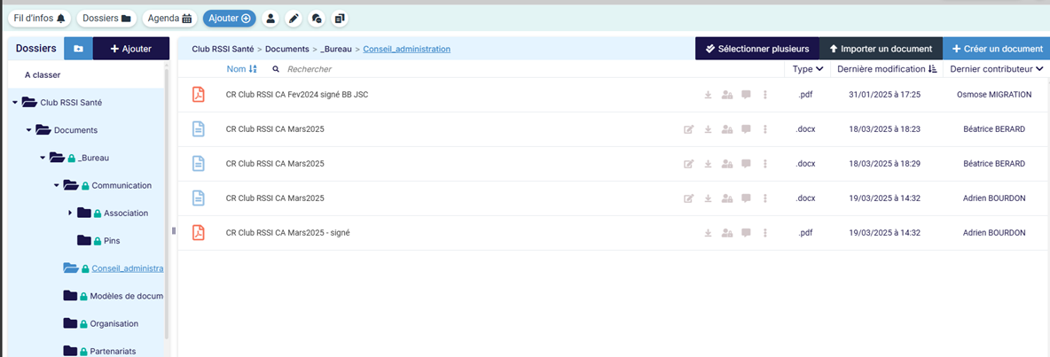 Salut Béatrice, C'est étrange, je n'ai pas accès à ces documents. Ce que je peux proposer, c'est que le temps que l'on trouve une solution, je m'occupe d'uploader les documents à destinations du bureau. Cordialement, [image003] [cid:image002.png@01DB98DB.37321350] Adrien BOURDON Responsable Sécurité des Systèmes d'Information Délégué à la Protection des Données Cellule Territoriale de Conformité Numérique Direction Générale GHT 85 Les Oudairies 85925 LA ROCHE SUR YON Tél. : 02 51 44 64 43 - Poste 26443 Por. : 06 14 83 65 64 https://chd-vendee.fr<https://chd-vendee.fr/> De : beatrice.berard--- par Bureau <bureau@listes.rssi-sante.fr> Envoyé : mercredi 19 mars 2025 12:34 À : bureau@listes.rssi-sante.fr Objet : [Bureau] Club RSSI - Réunion du CA Bonjour, Pour info, vous trouverez sous Resana / conseil d'administration le CR de la réunion du CA de lundi. Bonne journée [cid:image003.jpg@01DB98DB.37321350] C2 - Restreint [cid:image004.jpg@01DB98DB.37321350]<https://mibc-fr-06.mailinblack.com/securelink/?url=https://www.chu-lyon.fr&k...> Béatrice BERARD Officier de Sécurité des Systèmes d'Information (OSSI) des HCL OSSI du GHT Val Rhône Centre Direction des Services Numériques (DSN) Tél. 04 72 11 50 49 (31 50 49) beatrice.berard@chu-lyon.fr<mailto:beatrice.berard@chu-lyon.fr> Hospices Civils de Lyon DSII, Bâtiment A, 2ème étage 162 Avenue Lacassagne 69003 LYON www.chu-lyon.fr<https://mibc-fr-06.mailinblack.com/securelink/?url=http://www.chu-lyon.fr&ke...> [cid:image005.jpg@01DB98DB.37321350]<https://mibc-fr-06.mailinblack.com/securelink/?url=https://www.facebook.com&...> [cid:image006.jpg@01DB98DB.37321350]<https://mibc-fr-06.mailinblack.com/securelink/?url=https://twitter.com&key=e...> [cid:image007.jpg@01DB98DB.37321350]<https://mibc-fr-06.mailinblack.com/securelink/?url=https://www.linkedin.com&...> [cid:image008.jpg@01DB98DB.37321350]<https://mibc-fr-06.mailinblack.com/securelink/?url=https://www.youtube.com&k...>